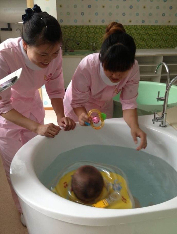 母嬰護(hù)理學(xué)員做嬰兒游泳工作