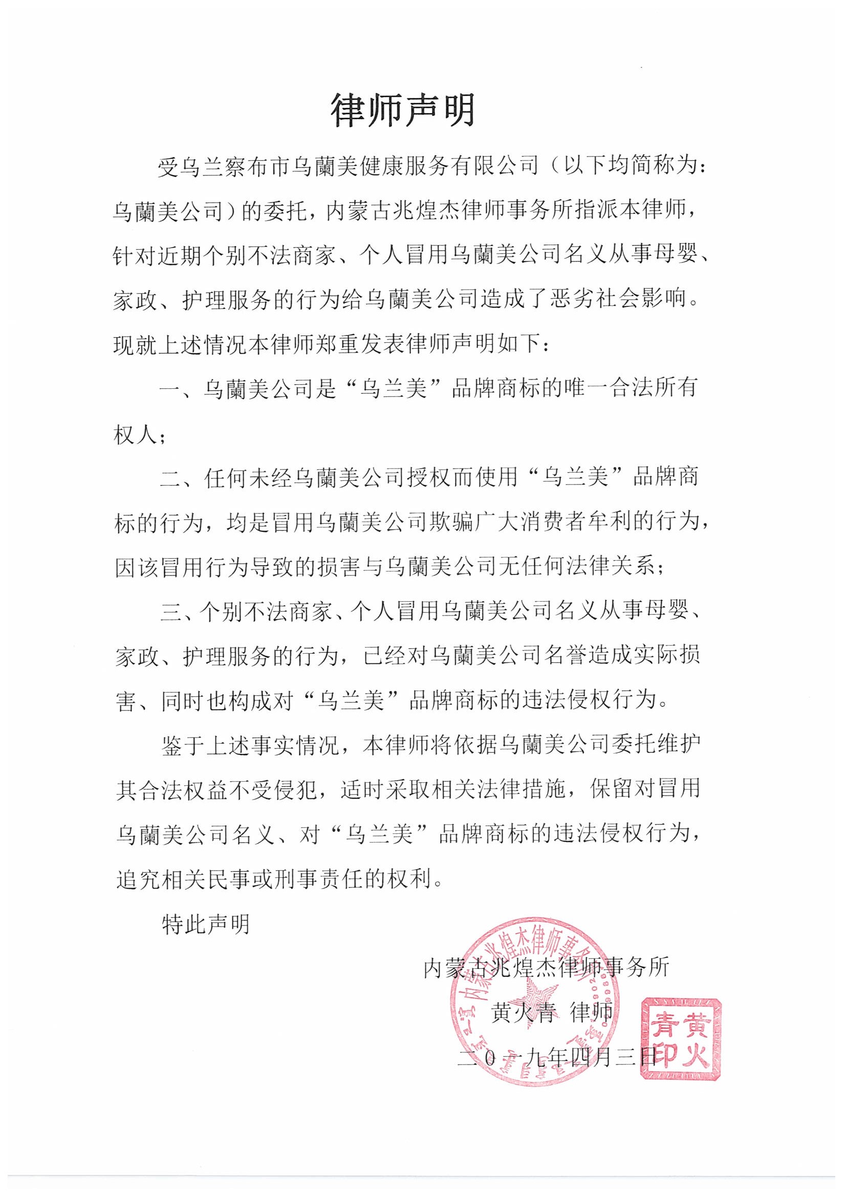 針對(duì)近期個(gè)別不法商家、個(gè)人冒用烏蘭察布市烏蘭美健康服務(wù)有限公司名義從事母嬰、家政、護(hù)理服務(wù)的行為,給公司造成了惡劣的社會(huì)影響?,F(xiàn)公司委托內(nèi)蒙古兆煌杰律師事務(wù)所黃火青律師,發(fā)表律師聲明如下: