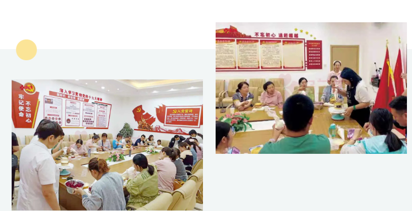 在烘焙師的指導(dǎo)下,大家認(rèn)真學(xué)習(xí)制作蛋糕的技巧——摩拳擦掌,打奶油;躍躍欲試,搓餅干;專心致志,做花邊。大家紛紛自己動(dòng)手,用打蛋器打出純滑扎實(shí)的奶油,裹在蛋糕胚上,涂抹轉(zhuǎn)刮,將切成塊的各種水果一層層疊加,隨后點(diǎn)綴鮮花,一個(gè)個(gè)色彩斑斕的蛋糕映入眼簾。不少準(zhǔn)媽媽們將愛國(guó)主題元素融入到蛋糕中,既體驗(yàn)到了制作蛋糕的快樂。又激發(fā)身邊人愛黨、愛國(guó)的情懷!