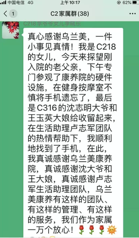 考慮到失主丟失財物焦急的心情,沈爺爺用餐過后便立即回到房間,正打算挨家挨戶找尋失主時,碰到了前來尋找手機(jī)的C區(qū)二樓生活助理團(tuán)隊們。“真的特別謝謝大家的熱心幫助,當(dāng)烏蘭美的護(hù)士和生活助理人員知道我的手機(jī)丟失后,都自發(fā)的幫我找尋手機(jī)。我真的感到特別的暖心,特別的貼心。經(jīng)過這次事情,我對我老父親住在這里一萬個放心!因為這里的工作人員不僅細(xì)心呵護(hù)、照顧老人,還守護(hù)了他們的財產(chǎn)安全。”